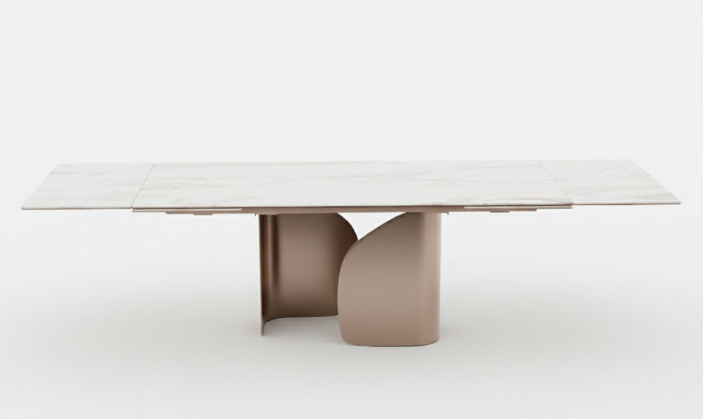 Twins is a table with a great visual impact thanks to its base, made up of two curved and moulded sheet elements that, like two wings, make the top take flight visually. Shown in-store in Calcatta Paonazzo Marble top with matte Pearl Beige base.