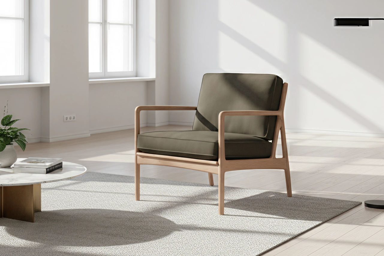 The Audley Armchair is a compact yet striking accent chair, crafted from solid oak and inspired by mid-century Scandinavian design. Its slender frame features a cane-woven back that provides a slight give for added comfort, while the foam-and-feather-filled seat cushion offers a soft, inviting finish. The armrests are gently widened at key points to create a comfortable resting place.
