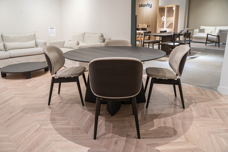 Table finished in smoked oil veneer, and chairs in smoked oil with sand grain fabric.
