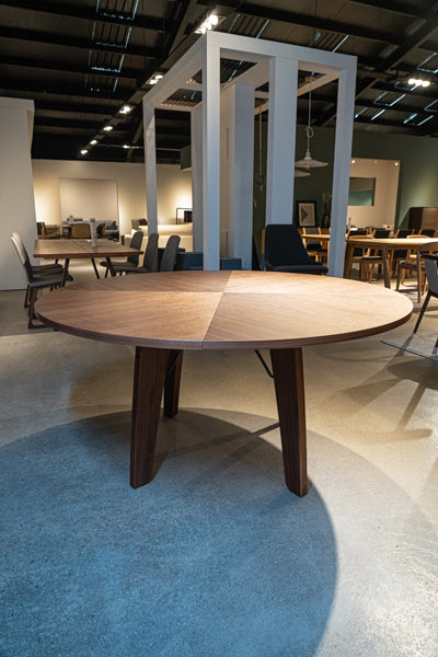A bold, contemporary round dining table with striking veneer patterning and durable details—perfect for entertaining up to 9 guests.
